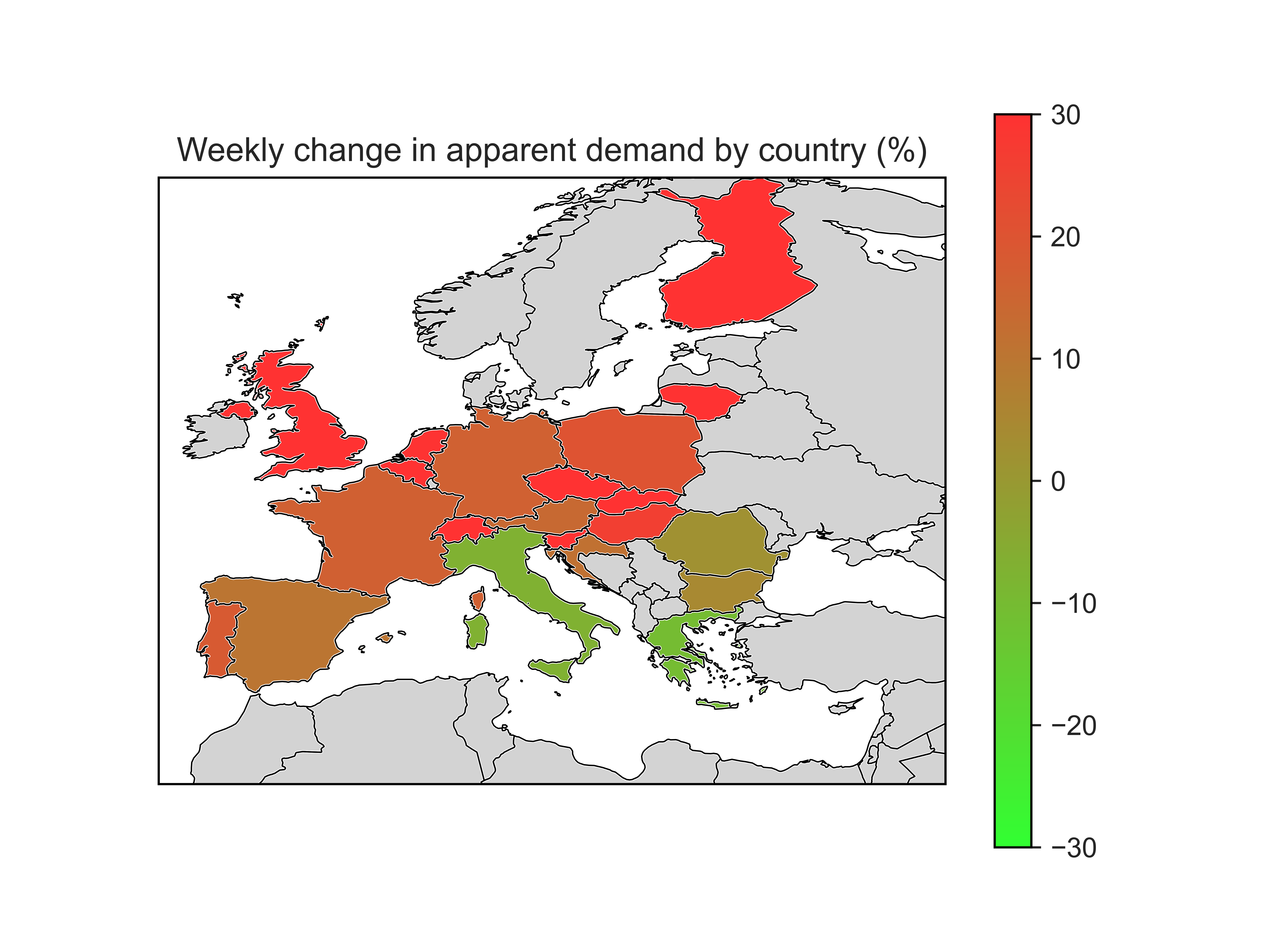 The map below visualises the change in apparent demand between the last seven days and the seven days prior for a selected group of European countries.